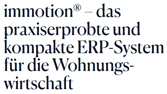 | Wenn Sie lieber alles selber machen möchten und dazu ein Profi-Programm suchen, dann sind Sie bei uns ebenfalls richtig. immotion® ist eine Immobiliensoftware für den unternehmensweiten Einsatz. Überzeugen Sie sich von immotion®, der Softwarelösung für die Wohnungs- und Immobilienwirtschaft. |